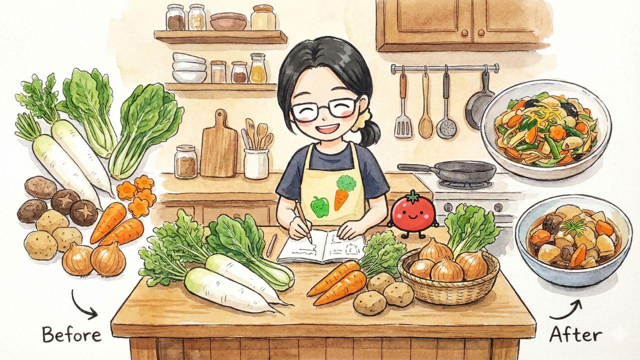 そんな毎日ごはんの献立設計のヒント、食材の写真とできあがった料理のビフォーアフターで